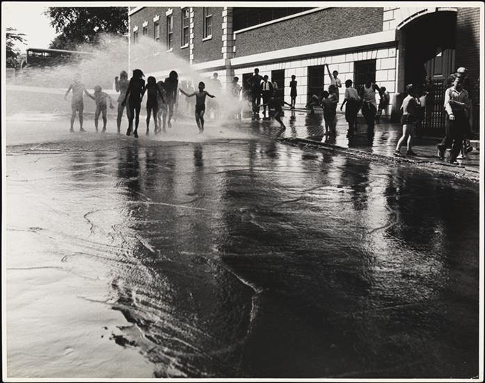 [Children playing in water from fire hydrant.]