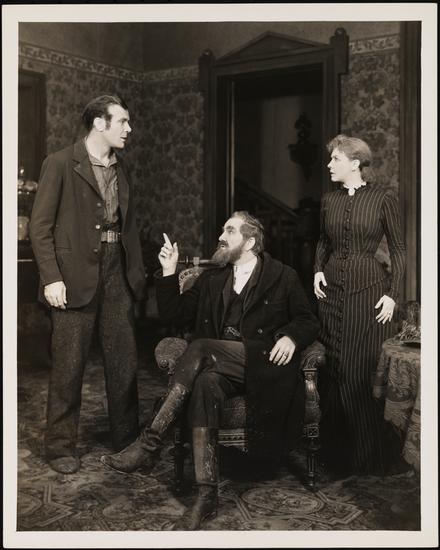[John Griggs as Dyke Hesse, Nancy Sheridan as Marie Hesse and Dean Jagger as Jan Gerart in "Farm of Three Echoes".]