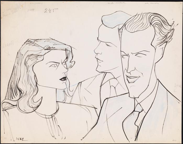[K. T. Stevens as A Girl, John Loder as Waldo Lydecker and Hugh Marlowe as Mark McPherson in "Laura".]