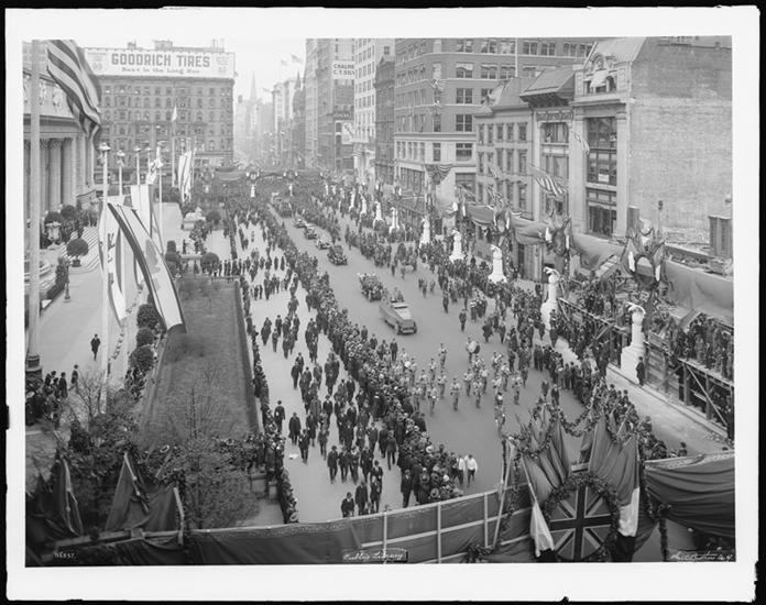 Public Library. Looking north through 5th Avenue from below 40th Street. [Mayor's Committee to Welcome British & French War Commissions.]