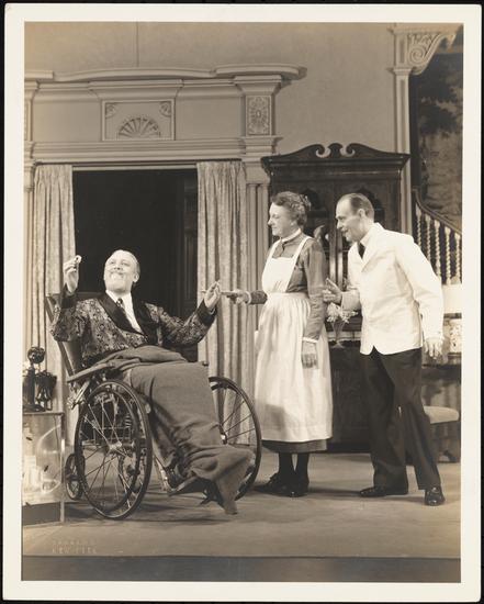 [Monty Woolley as Sheridan Whiteside, Claudia Morgan as Maggie Cutler and Muriel Hutchison as Lorraine Sheldon in "The Man Who Came to Dinner".]