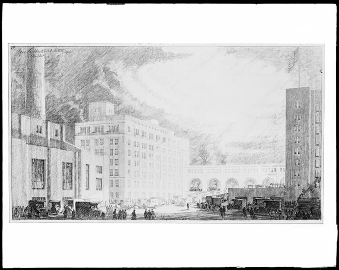 Second set of drawings of Army Base, the pier ends, rendering by Hugh Ferriss, 1918.