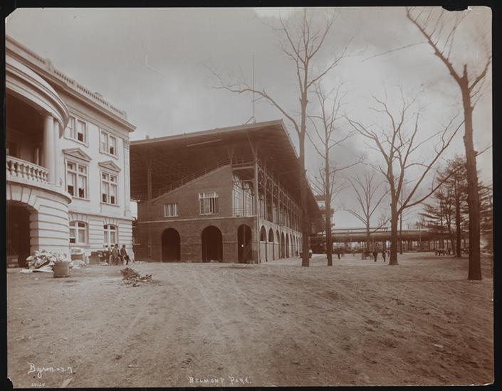The grand-stands at Belmont Park Race Track, Elmont N.Y.; elevated railroad beyond.