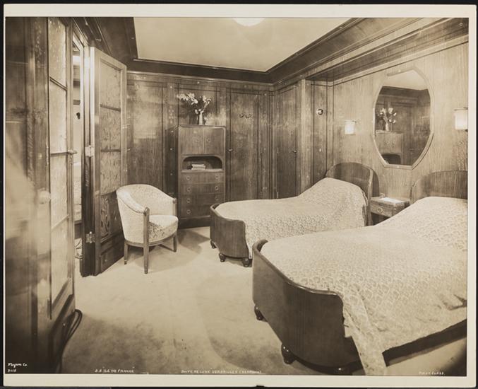 French Line, S.S. "Ile de France", Interior, Suite de Luxe (Senlis) Bedroom.