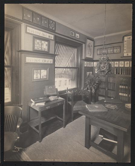 Office of Walter Dunn, publisher; elaborate chandelier, books and office furniture visible.