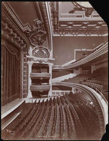 Description The Majestic Theatre, located in Columbus Circle, 59th Street and Broadway, New York City, showing both the auditorium and the procenium and curtains.