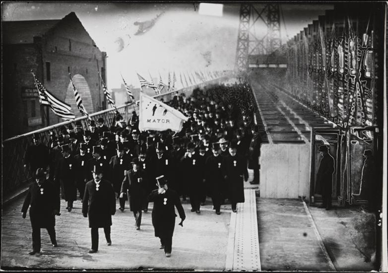 [Mayor Seth Low and officials crossing Williamsburg Bridge]