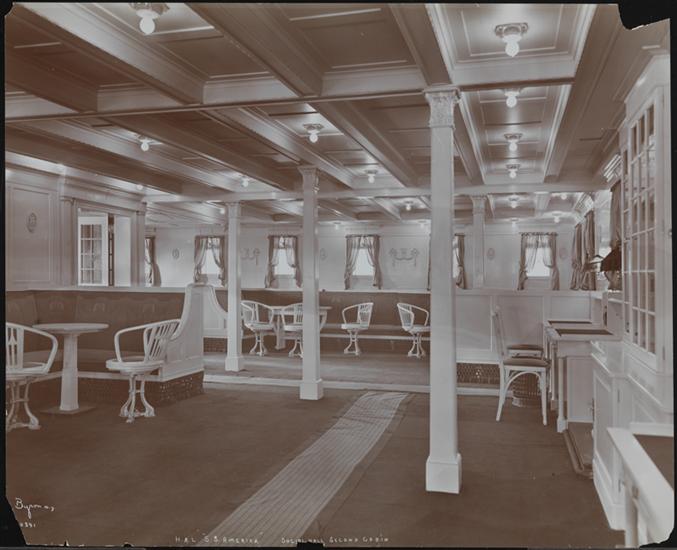 "H.A.L. 'S.S. Amerika', Social Hall, Second Cabin" on neg.