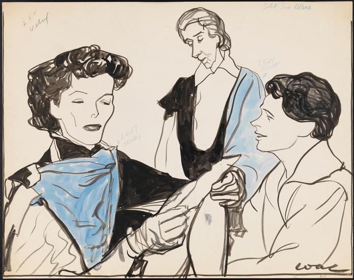 [Judy Parrish as Phoebe, Katharine Hepburn as Rosalind and William Prince as Orlando in "As You Like It".]