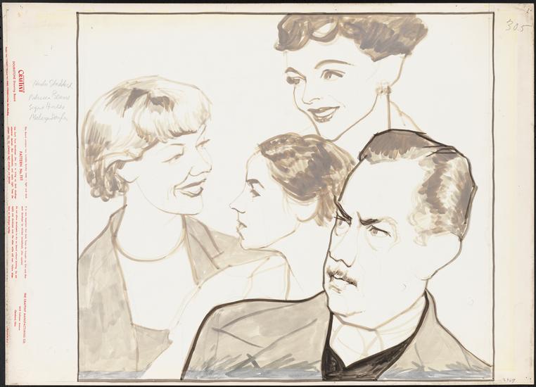 [Haila Stoddard, Melvyn Douglas, and Signe Hasso rehearsing for "Glad Tidings".]
