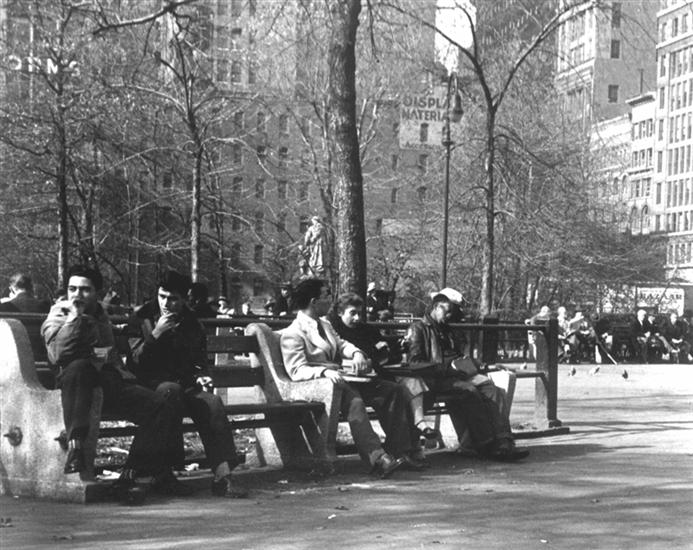 Untitled [Men sitting at base of flagstaff, Union Square]