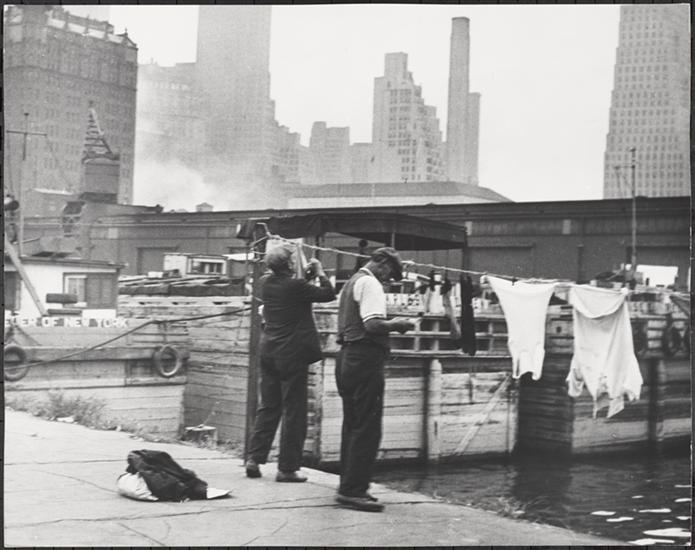 [Destitute men sleeping on East River pier with Brooklyn skyline visible.]
