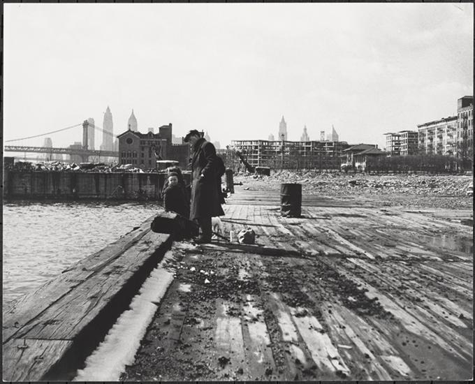 [View of the waterfront below the construction of the Brooklyn Bridge.]
