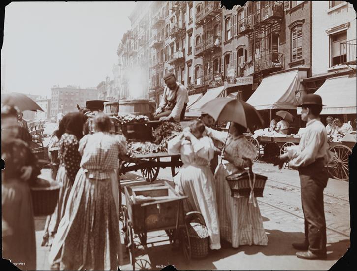 Women shopping at a food vendor's cart on Hester Street or Essex Street.