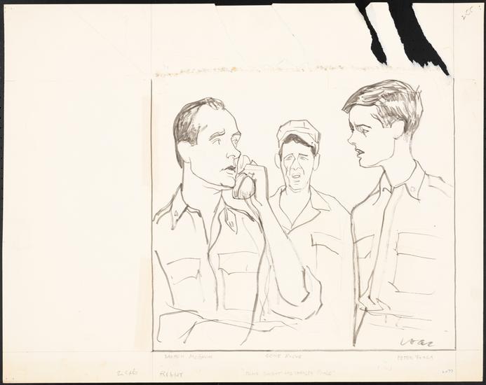 [Gertrude Musgrove as Lt. Thomasina Grey, Bramwell Fletcher as Capt. Sutton and Myron McCormick as 1st Sgt. Peter Moldau in "Storm Operation".]