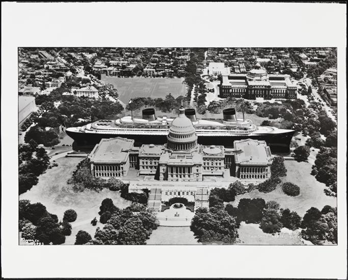 [Photomontage of an Ocean Liner on an Aerial View of Central Park South.]