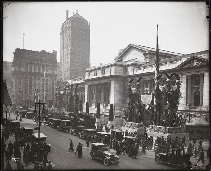 Library, Public, 5th Ave. & 42nd St., Exterior, Building with War Decorations.