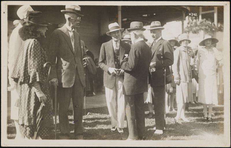 [Mayor Jimmy Walker and other men watch as an unidentified man picks flowers.]