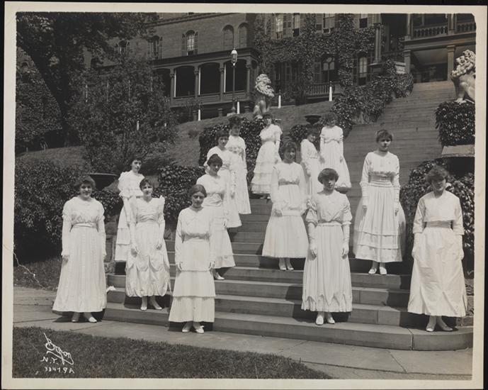 Class of female students posed on steps at the Academy of Mount St. Vincent, Riverdale.