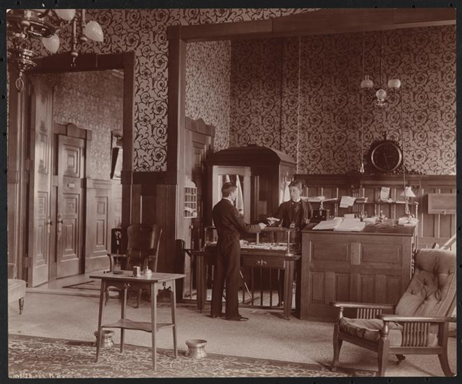 Description Reception area of the clubhouse of the Turf and Field Club with two clerks at desk.