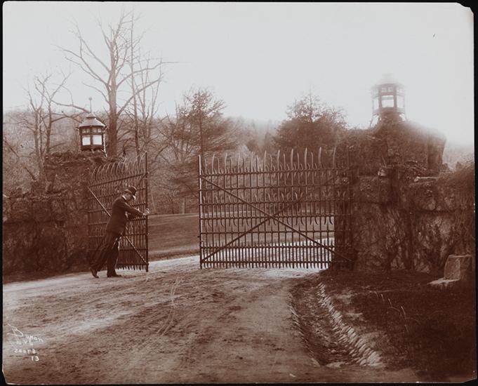 [A man closing the gates to the C.B. Alexander, Esq. estate at Tuxedo Park, N.Y.]