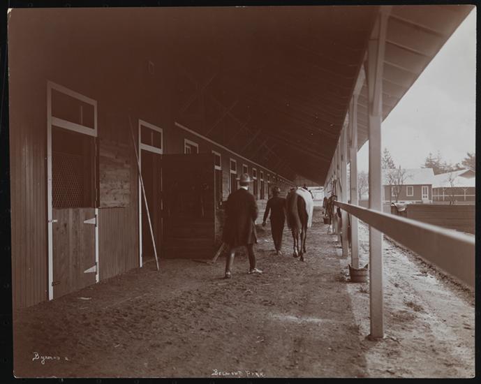 Two men and a horse at the stables at Belmont Park Race Track, Elmont N.Y.