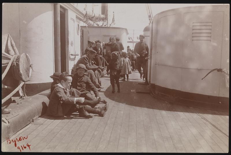 Steerage passengers, children and adults, sitting on a deck of the S.S. "Ethiopia".
