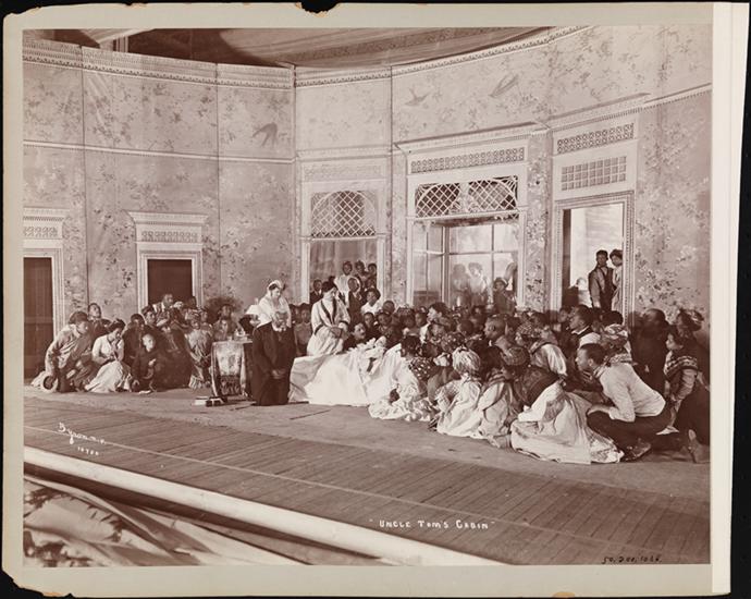 A scene from William A. Brady's production of "Uncle Tom's Cabin" from Harriet Beecher Stowe's novel, presented at the Academy of Music in 1901 and featuring Wilton Lackaye as Uncle Tom and Theodore Roberts as Simon Legree.