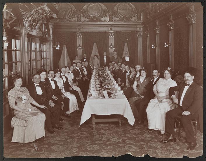 Men and women seated at a long table in a banquet/dining room at a dinner.