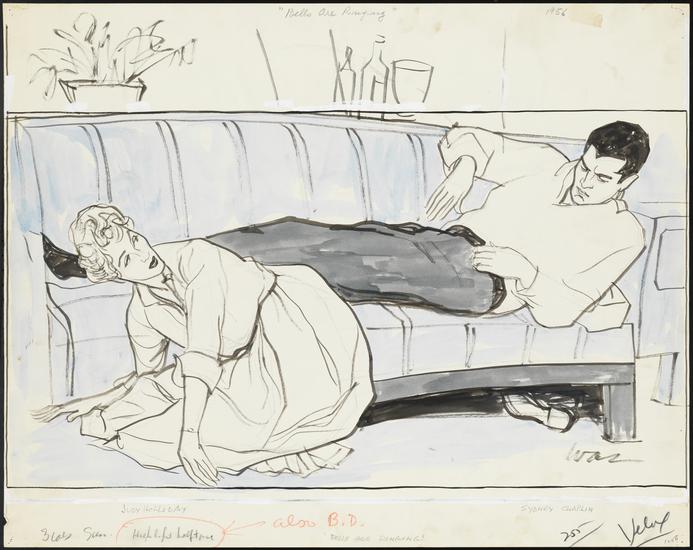 [Sydney Chaplin as Jeff Moss and Judy Holliday as Ella Peterson in "Bells Are Ringing".]