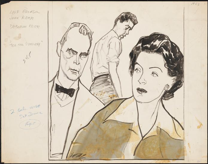 [John Kerr as Tony Burgess, Diana Wynyard as Grace Nicholson and Lloyd Gough as Carl Nicholson in "Cue for Passion".]