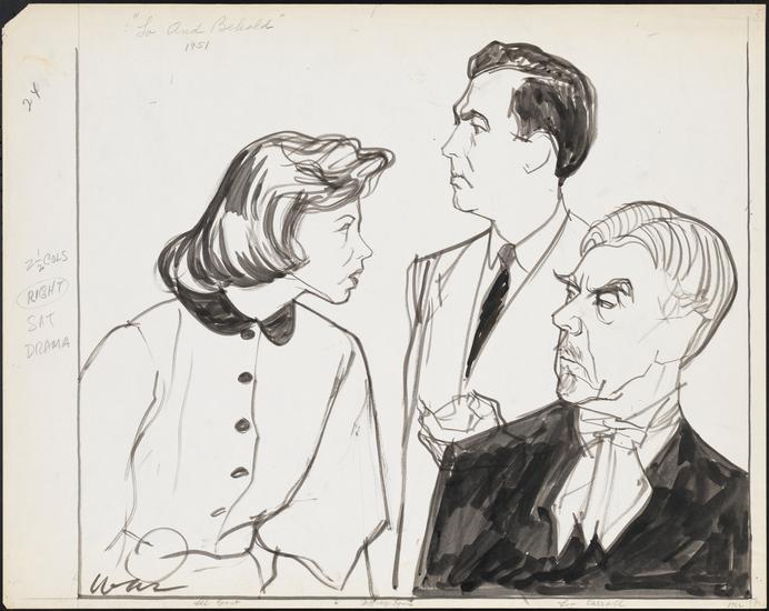 [Lee Grant as Daisy Durdle, Leo G. Carroll as Milo Alcott and Jeffrey Lynn as Dr. Robert Dorsey in "Lo and Behold!".]
