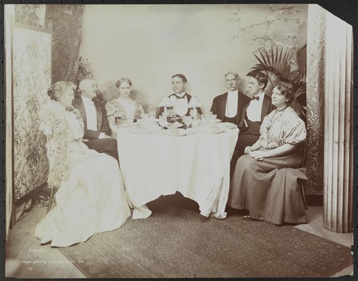 Four men and three women formally dressed, seated at a table at a dinner given to Arnold Bennett, novelist and dramatist, at Harper Brothers.