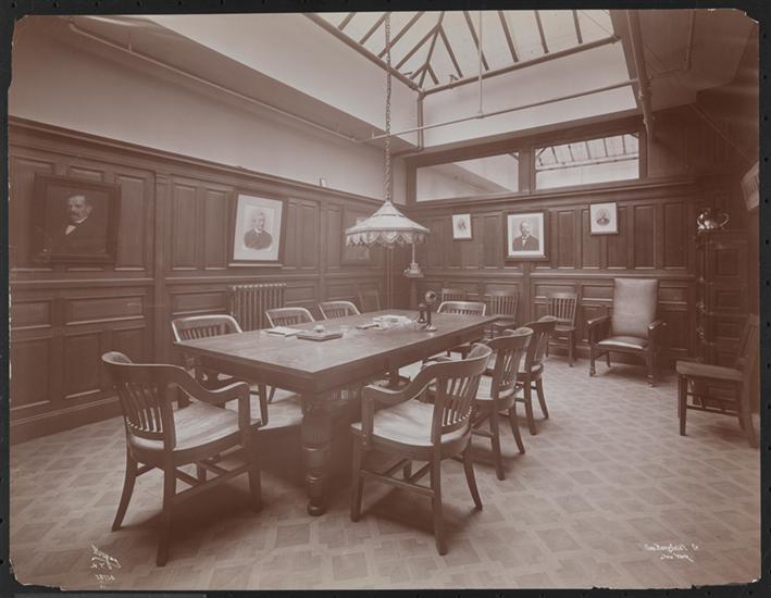 Interior of George Borgfeldt & Co. conference room, with table and chairs, chandelier, portraits and telephone visible.
