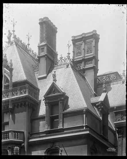 52nd Street and 5th Avenue, N.W. corner. W.K. Vanderbilt residence, detail of balustrade, dormers and chimney.