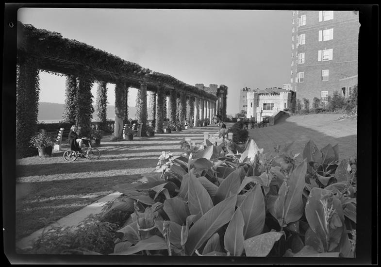 [Girl looking from the pergola over the Conservatory Gardens.]