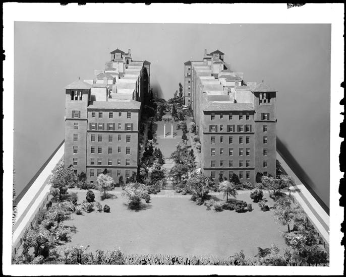 23rd Street and Hayes Avenue. The Towers, detail of entrance to apartments horizontal view.