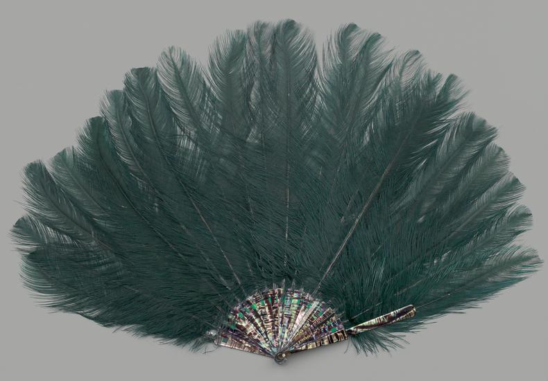 Folding feathered fan of shell pink ostrich and grey marabou feathers