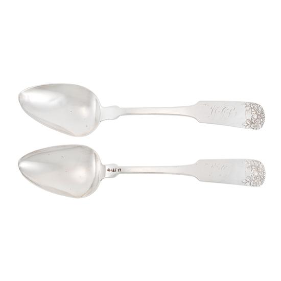 One of a pair of tablespoons with egg-shape bowl, downturned fiddle handle, and die-struck with a basket of flowers on the handle end. Inscription: Engraved on handle obverse: "WJS" in feathered script. Mark: On handle reverse: "WM. W. WHITE" in rectangle.