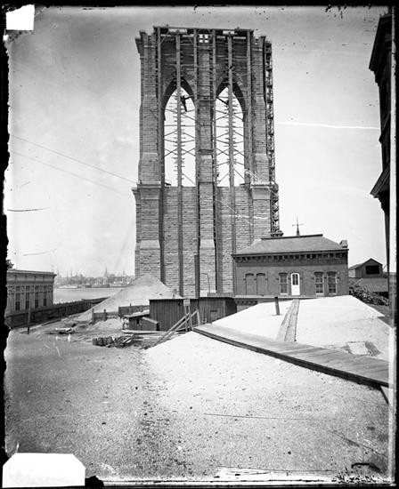 [Brooklyn Bridge Tower under construction.]