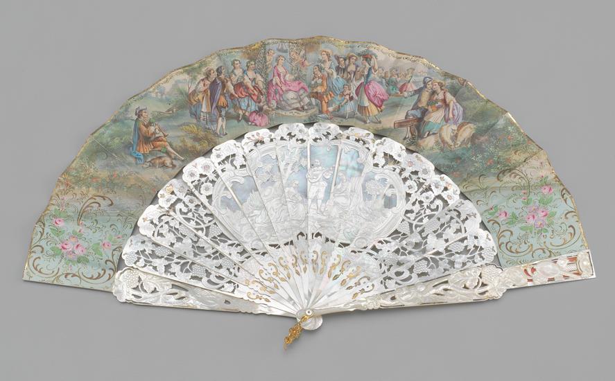 Folding fan of painted leaf depicting 18th-century style figural vignette and musical trophies