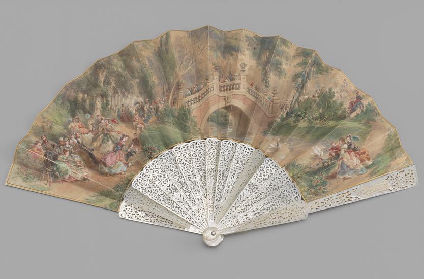Folding fan of painted skin leaf, depicting ladies in Spanish attire feeding swans