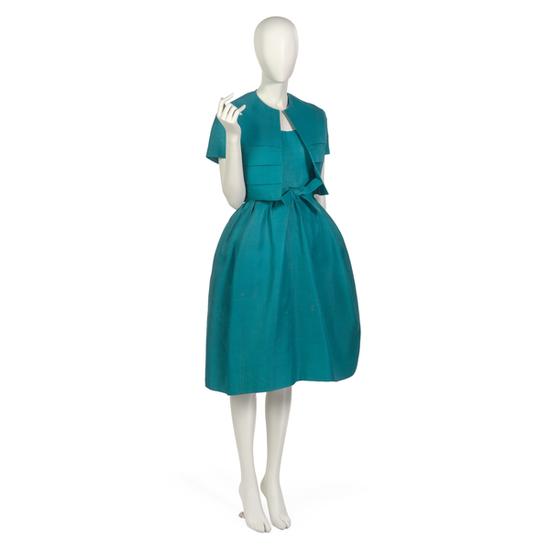 Evening ensemble comprising dress and bolero in peacock blue silk taffeta