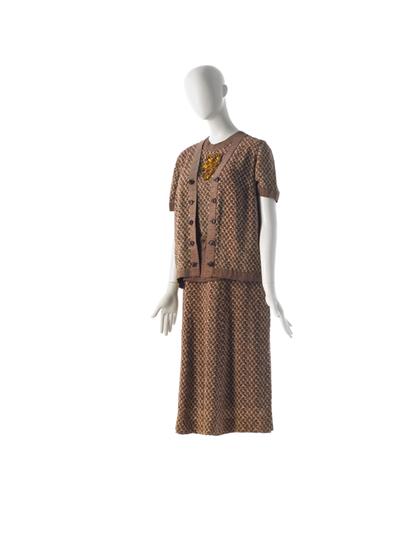 Dinner dress and jacket in black silk with beaded palm tree motif