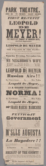 Saturday evening, August 9, 1856. Grand gala night for the first benefit in America of Mlle. Robert on which occasion the wonderful Ravels and young Hengler will appear