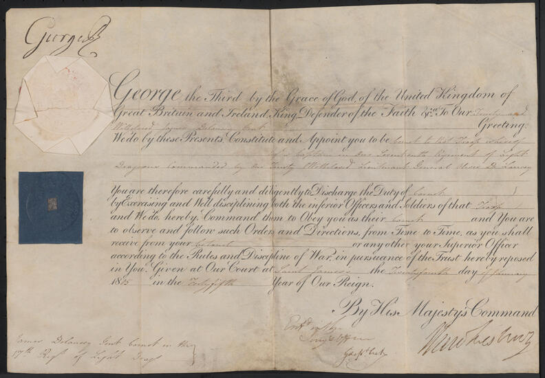 Military commission issued by King George III to James De Lancey to serve as Major in the 9th Regiment of Light Dragoons, December 4, 1817