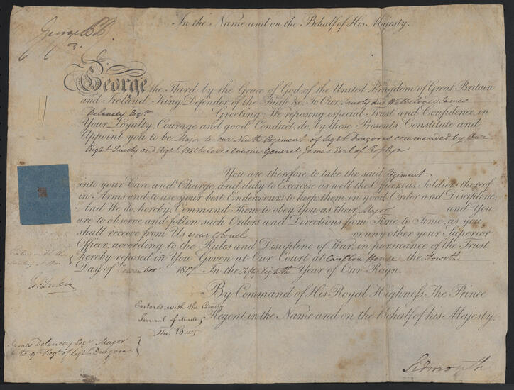 Military commission issued by King George III to James De Lancey to serve as Captain in the 9th Regiment of Light Dragoons, May 19, 1808
