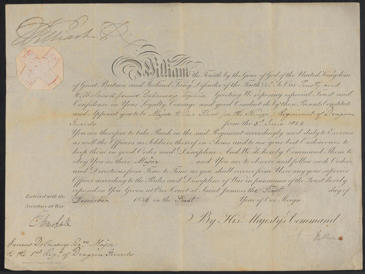 Military commission issued by King William IV to James De Lancey to serve as Major, December 1, 1830