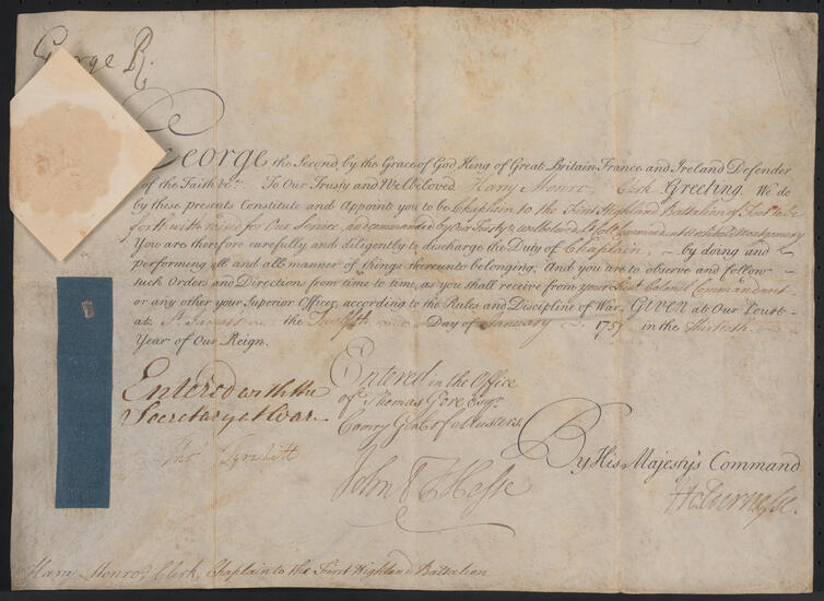 Military commission issued by King George III to James De Lancey to serve as Captain in the 9th Regiment of Light Dragoons, May 19, 1808