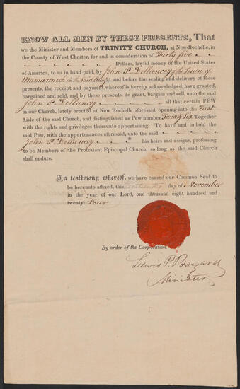 Lease for pew #24 in Trinity Church, from William E. Dunscomb to Edward Floyd De Lancey, January 18, 1865